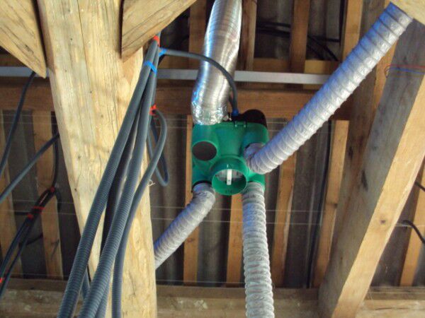 Ondertussen was onze elektricien ook druk bezig met het trekken van nog enkele leidingen (ik dacht dat ze allemaal al waren gelegd maar dit was nog niet het geval), en heeft hij ook de 1ste VMC geplaatst. Een VMC zorgt ervoor dat er een permanente verluchting is in de kamers, badkamers en in ons geval ook de keuken. Het is een systeem dat frisse lucht constant rondstuurt en "onfrisse" lucht naar buiten stuurt. We hebben ook nog eens even de plannen gewijzigd... Voor de 2de keer zal de badkamer van de gastenkamer op de 2de verdieping een andere plaats krijgen... hopelijk hebben we nu de juiste beslissing genomen want als alle kabels en leidingen (zowel van elektriciteit als van sanitair) hun plaats hebben is er geen weg meer terug. Maar ik heb nu wel het gevoel dat we de juiste beslissing genomen hebben.