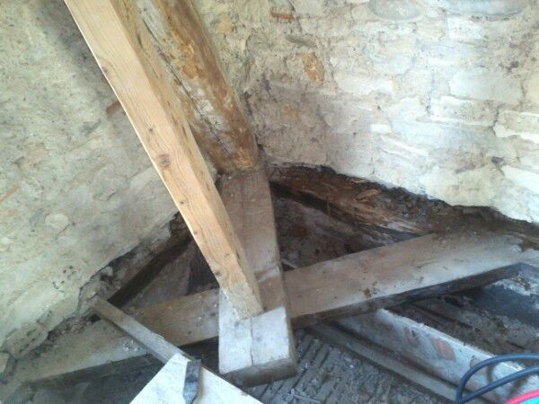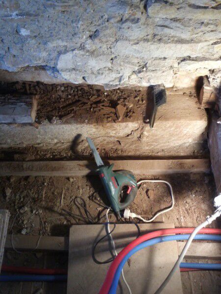 Ondertussen is alles wat dakwerken betreft afgerond en gaan we onze focus meer leggen op de "grondwerken" maw de vloer. Het dakgebinte steunt volledig op de 4 buitenmuren d.m.v de schuine balken. Deze schuine balken staan niet direct in verbinding met de buitenmuren maar rusten eerst op andere houten balken die gelegd zijn in de buitenmuren (zie eerste foto). Het hout heeft de tand des tijds niet overal even goed doorstaan. Door insijpeling van water is er op sommige plaatsen houtrot opgetreden. We moeten eerst de rotte stukken wegsnijden om daarna nieuwe balken te kunnen leggen en de holtes tussen de balken en de muur op te vullen met cement. Dit is al een eerste stap voor het leggen van de OSB platen want we moeten uiteindelijk kunnen vertrekken van een ruimte die gelijk en waterpas ligt.