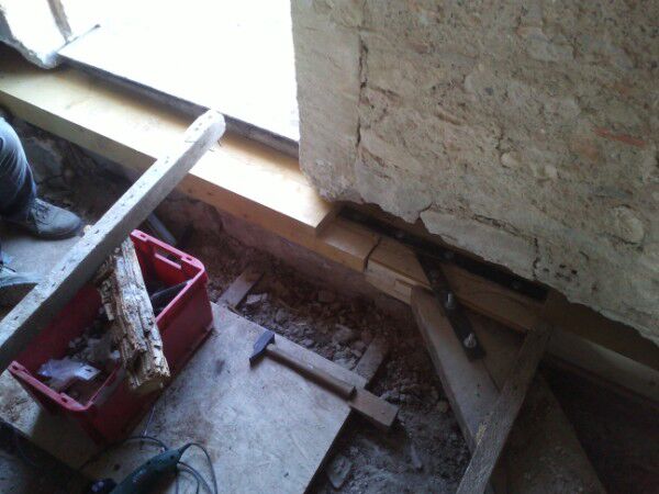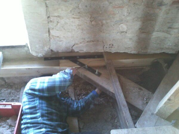 Na ruim een anderhalve week vrieskou zijn we eindelijk terug kunnen beginnen boven op de de 2de verdieping. We hebben verder gedaan waar we toen gestopt waren namelijk opkuisen van puin en vervangen / in orde maken van de houten balken. Dit is nu voor 3/4 gedaan maar het moeilijkste deel om te vervangen moet nog komen. Morgen zullen we ook kunnen beginnen met het "gieten" van mortel/beton op basis van kalk achter de balken om een betere aanhechting met de muren te bekomen. Het is daar nu nog net iets te koud voor.