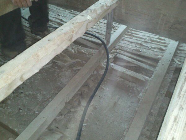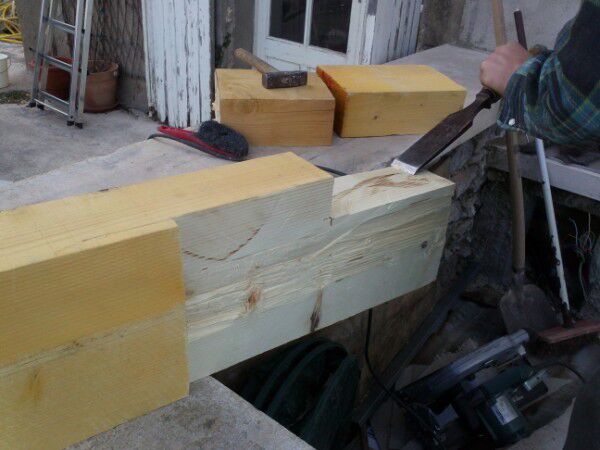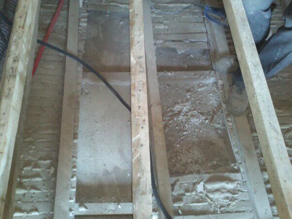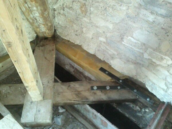 Ondertussen zijn alle rotte balken vervangen. Zoals gedacht was het laatste deel het moeilijkst... maar ze zeggen altijd "save the best for last...". Nadien konden we eindelijk beginnen om het hout te behandelen tegen termieten. Net zoals we in de zomer gedaan hadden voor het houten dakgebinte moeten we ook dit hout behandelen. Natuurlijk ging dit veel sneller want er is niet zoveel te behandelen en je kan er overal makkelijk aan. Normaal gingen we vandaag de ruimte achter het hout opvullen met een mengeling van kalk en cement maar omdat het net iets te frisjes was hebben we dit naar een van de volgende dagen uitgesteld. Ondertussen zijn we dan begonnen aan het verstevigen van het originele plafond aan de dikke dwars balken. Omdat we overal op de 1ste verdieping valse plafonds gaan leggen moeten we zeker zijn dat de balken waar het originele plafond op rust het gewicht kunnen dragen van het vals plafond. Door middel van een versteviging met ijzeren haken mag dit geen probleem zijn.