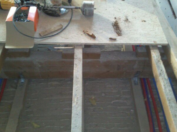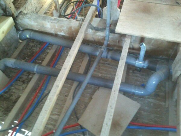 Ondertussen is het sanitair ook zo goed als klaar. Alle aflopen zijn geplaatst en de buizen die zorgen dat de lucht weg kan zijn zo goed als klaar. Nog een beetje werk en we kunnen al beginnen denken aan het dichtleggen van de plancher... alhoewel dit nu nog als toekomstmuziek klinkt ;)