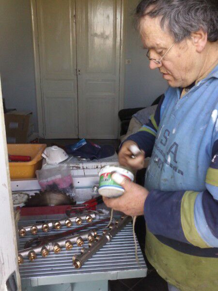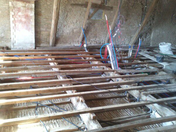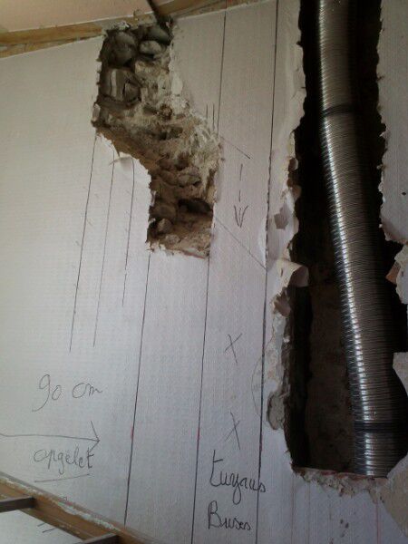 Jacques heeft de gleuf in de muren gekapt om zo de leidingen van het water en de collectors door te trekken naar de 1ste verdieping en kelder. Nog een beetje kappen en hij is er ;).