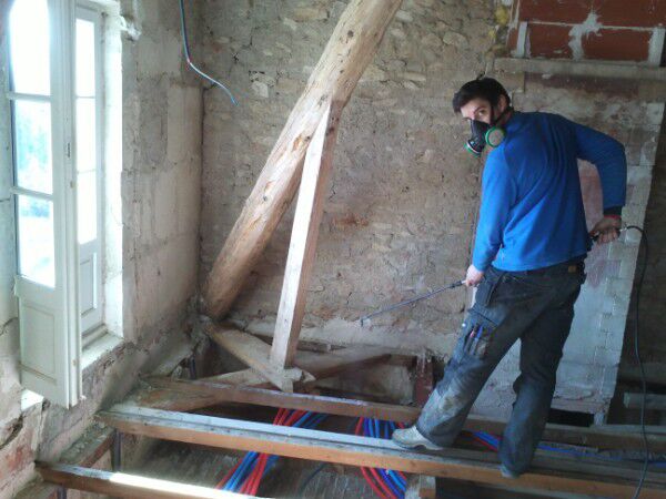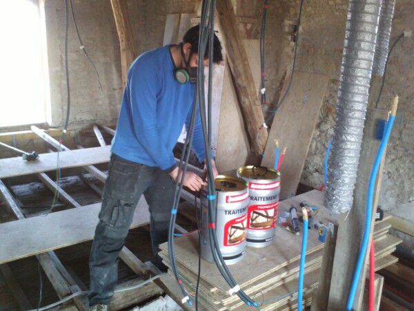 Na het laatste bericht hebben we een kleine wijziging moeten doorvoeren in de planning. Normaal gingen we de haakjes al bevestigen voor het vals plafond op de eerste verdieping maar dat gaat niet zonder gaten te maken in het originele plafond. Omdat we de houten balken waar de OSB platen worden opgelegd nog met product tegen termieten moeten behandelen zou dit betekenen dat het product tot op de eerste verdieping zou doorsijpelen... We hebben dus eerst de 2de verdieping volledig leeg gemaakt (een hele klus), alle OSB platen die er her en der lagen opgeruimd, en dan met "volle moed" begonnen aan de behandeling. Ondertussen zijn we dit een beetje gewoon want we hebben het houten dakgebinte en de houten balken in de muur ook telkens 3 lagen moeten geven. Nu zijn we er eindelijk van verlost voor een tijdje.