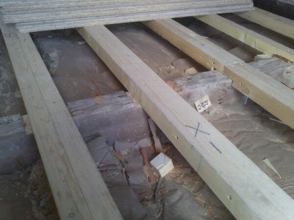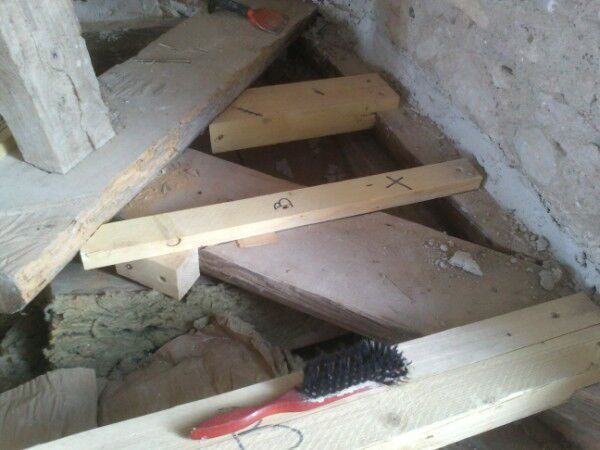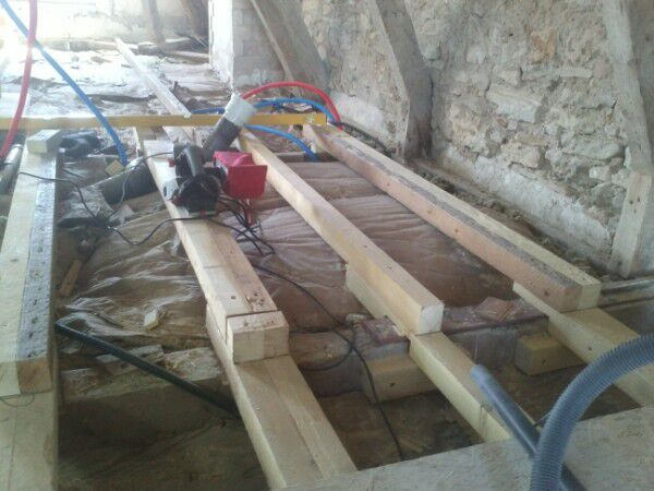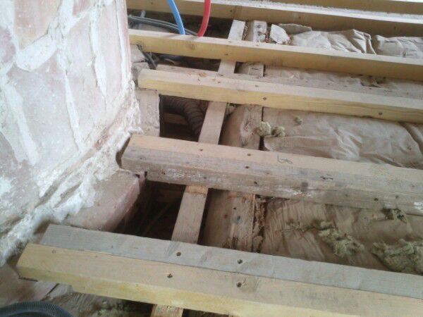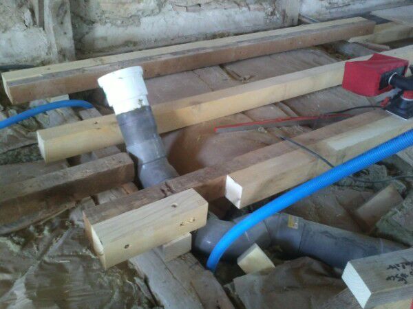De volgende hindernis is de ruimte achter de trappenhal. Daar moeten we al onze balken laten steunen op de stenen. Natuurlijk hebben zie hier 150 jaar geleden niet aan gedacht en moesten we veel slijpen om alles waterpas te krijgen (zie foto 5). Als laatste nog de badkamer van de gastenkamer. Omdat hier de grote afvoerbuis vertrekt is dit ook het hoogste punt (om genoeg helling te geven). Dit wordt dus nog een niveau apart (zie foto 6 en 7). Zo zien jullie dat we niet gewoon wat balken moeten leggen maar dat er wel heel wat problemen zijn met het verbouwen en het proberen waterpas te leggen van een oud huis ;)