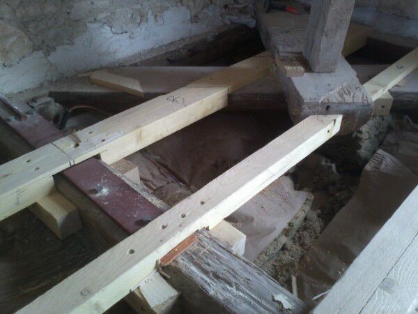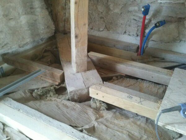 Het eerste obstakel is dat het huis zich met de jaren gezet heeft. Van links naar rechts is er een verschil van ruim 5 cm. Omdat aan de achterkant al onze ramen tot aan de grond komen moeten we ervoor zorgen dat we laag genoeg beginnen met het niveau. Omdat er een verschil is van 5 cm moeten we aan de andere kant de balken uitzagen om ze zo over de grote steunbalken te krijgen (zie foto 1 en 2). Hier kruipt veel tijd in aangezien we die balken moeten zagen met een zaagmachine die beneden staat... Dan hebben we ook het probleem van de hoeken. Dit zijn de grote steunpunten van het dak en deze zijn telkens voorzien van grote diagonale dwarsbalken. Op foto 3 en 4 kan je zien dat we langs de ene kant van het huis nog op de balken zitten maar aan de andere kant moeten we onze balken al inwerken. Veel zagen en prutsen dus...