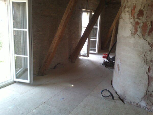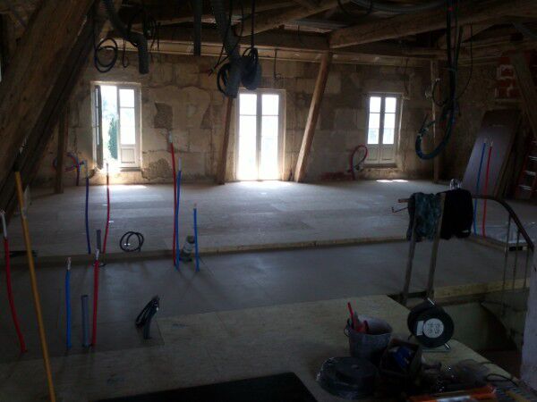 Na een kleine vakantie in België heeft het gewone leven z'n draad weer opgepakt. Boven zijn alle OSB platen gelegd, evenals de waterbestendige platen die we voor de badkamers gebruiken. Eindelijk is alles dicht en kunnen we gaan en staan waar we willen. Ondertussen zijn we begonnen aan het plaatsen van het dampscherm waar ik volgende keer een beetje meer uitleg en foto's van zal posten. Zoals ik lang beloofd had moest er dus een flesje champagne aan geloven en tja belofte maakt schuld. Maar het heeft enorm gesmaakt. Nu heb ik enkel nog dat flesje wijn dat ik ga kraken als de chambre d'hôte opengaat, maar die zal nog gerust 2 jaar kunnen rijpen in onze kelder.