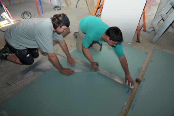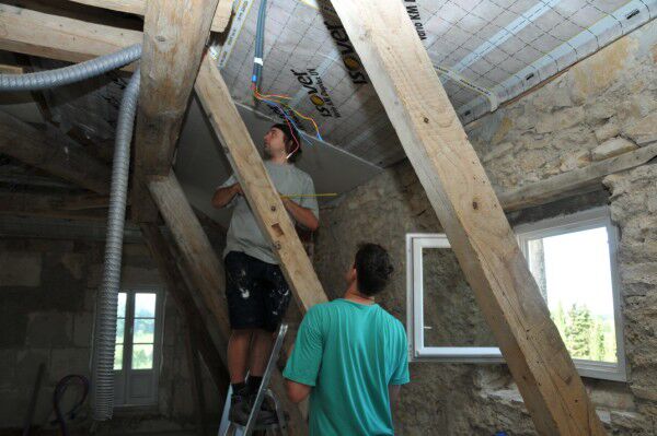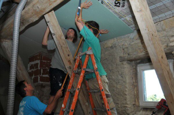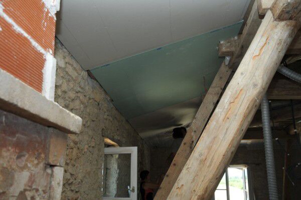 De voorbije week hebben we de laatste hand gelegd aan het dampscherm en zijn we van start gegaan met het plaatsen van de gyproc platen aan de schuine zijden van het plafond. In elk bericht aangaande het plafond komt wel hetzelfde probleem terug... de hoeken en houten balken. We wisten dat dit moeilijk ging zijn om al deze balken, hoekjes en schuine zijden perfect uit te snijden. Na een beetje proberen hebben we eindelijk een goede manier gevonden om het werk een beetje sneller te laten gaan. Enfin we komen er wel...