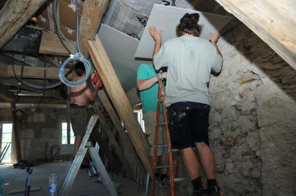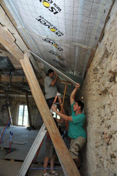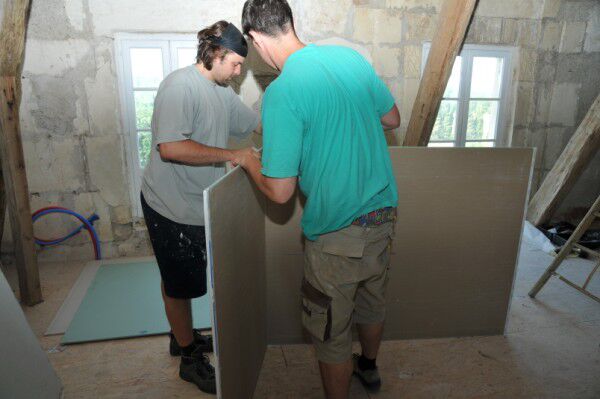 La semaine passée nous avons terminé le placement du pare vapeur et nous avons commencé à poser les plaques de gyproc.Ceci n’est pas facile car nous devons tenir compte des coins et des poutres.Mais nous y arriverons. Comme il a fait très chaud ces derniers jours (35° en journée et 27° le soir) nous avons décidé de mettre la piscine en route.Nous l’avons vidée de toutes les saletés et il nous reste à nettoyer les faïences avec un produit qui enlèvera le calcaire.Bientôt nous pourrons nous rafraichir dans la piscine.