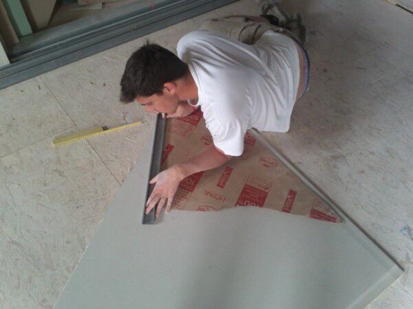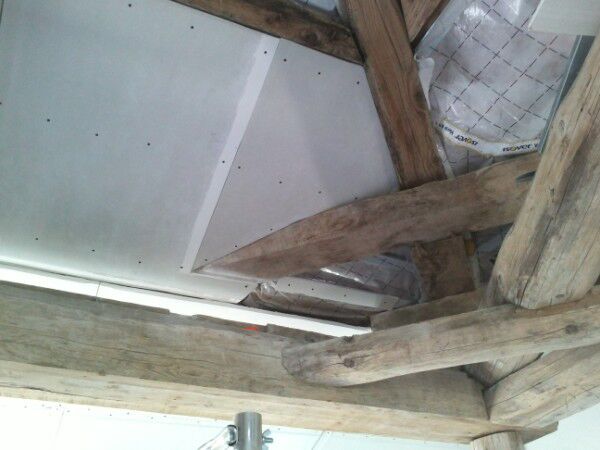 Het schuine plafond is nu bijna afgewerkt. Zoals jullie op onderstaande foto's kunnen zien komt er zeer veel snijwerk aan te pas. Om niet te veel te knoeien hebben we eerst de vorm gesneden op een stuk karton. Zo konden we proberen of de vorm paste en eventueel aanpassen. Het spreekt voor zich dat hier zeer veel tijd inkruipt maar het resultaat zal uiteindelijk mogen gezien worden.