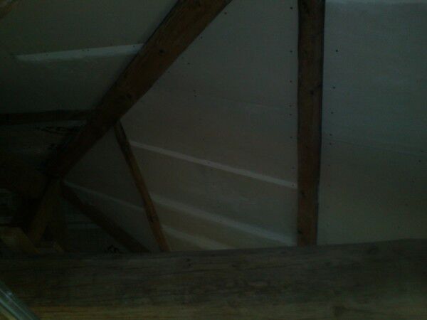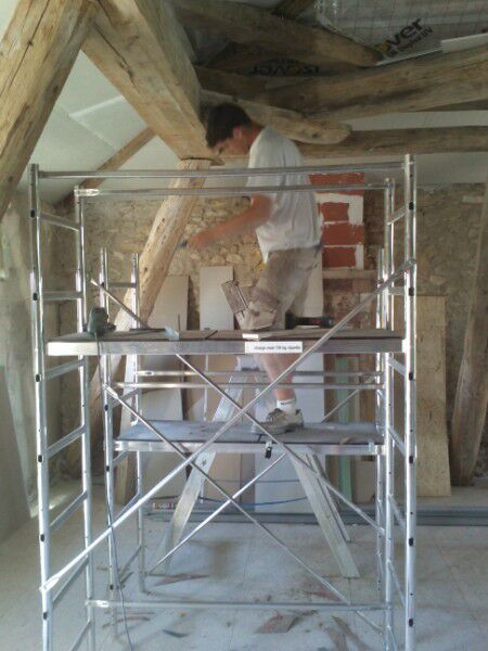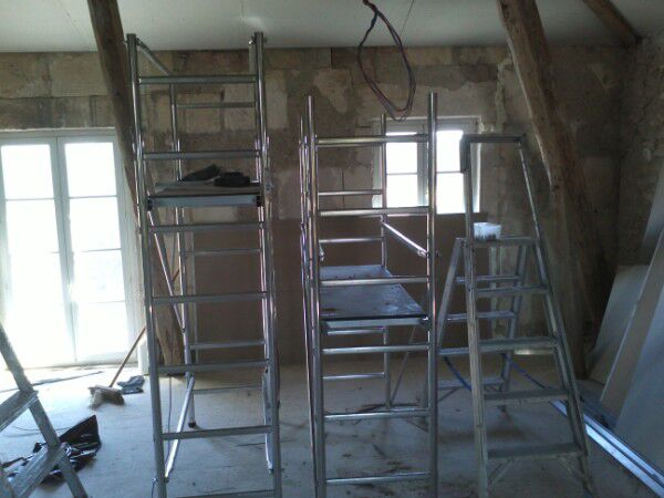 Voor de werken te vergemakkelijken hebben we ons een stelling gekocht. Een zeer handig ding als je met gyprocplaten in de hoogte moet werken. Het is een stelling van 6 meter maar zoals je kan zien op de foto kunnen we er 2 aparte van maken. Nog een paar dagen werk en het schuine plafond is klaar. Dan kunnen we eindelijk beginnen aan de muren.