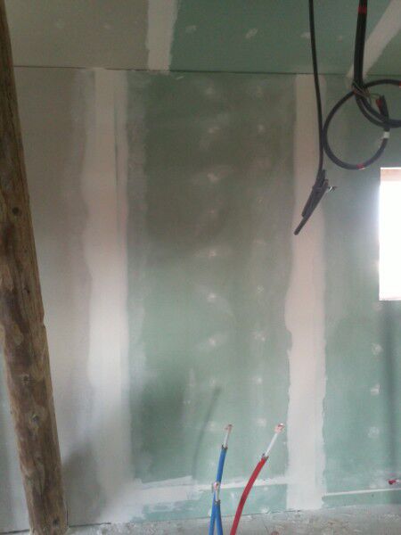 Ondertussen zijn we bijna klaar met "het leukste werk", namelijk het bepleisteren van de gyprocplaten. Geen van ons beiden die het ooit al gedaan had. Op youtubefilmpkes leek het allemaal oersimpel tot je het uiteindelijk zelf moet doen. Eigenlijk moet ik zeggen dat we het er goed vanaf gebracht hebben. De buitenmuren zijn al klaar; overal 2 lagen en hier en daar moet er nog een 3de laag komen. De helft van het plafond heeft zijn 1ste laag reeds gehad. Hier worden we nogmaals geconfronteerd met het dakgebinte dat het er niet makkelijker op maakt om overal mooi tussen te gaan met het plamuurmes. Ik denk dat we hier wel eens gaan vloeken als we de definitieve laag moeten doen...