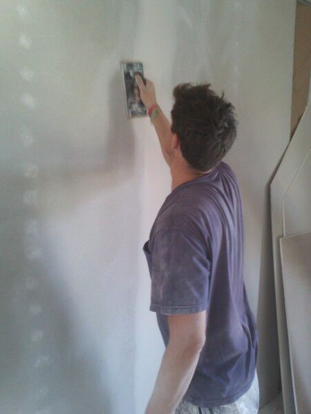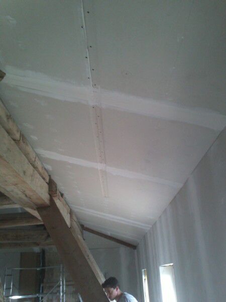 Bepleisteren van de gyprocplaten / Jointoyer les plaques de plâtre.