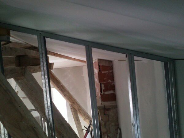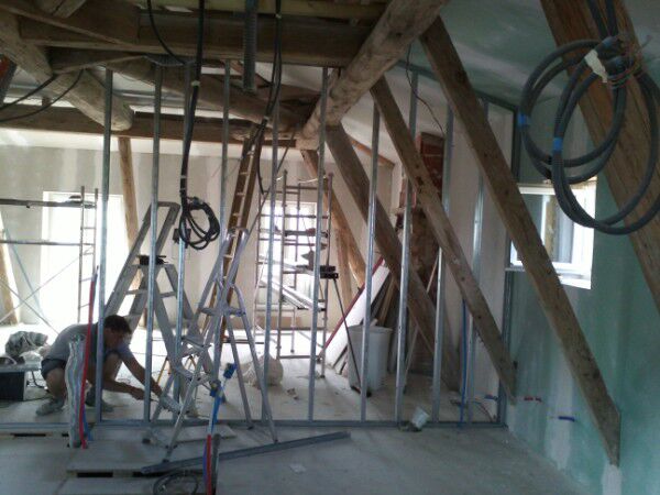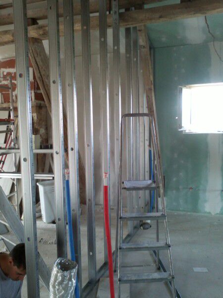 Nous avons presque terminé le ponçage des plaques de plâtre (par ci par là encore quelques finitions). Maintenant nous avons commencé à mettre les murs intérieurs.