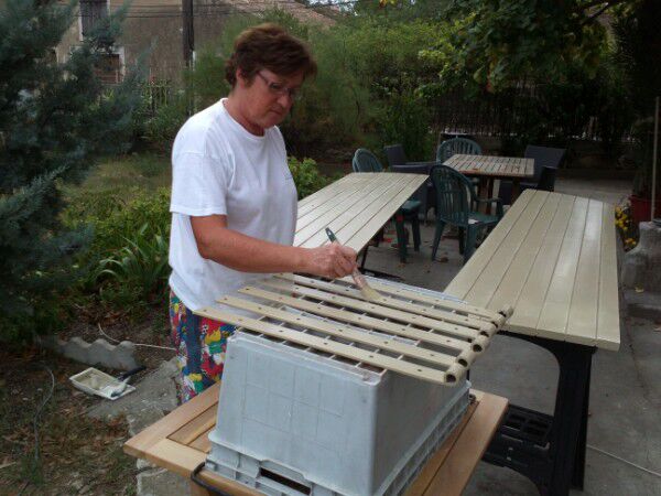 Mady et Maggy ont pris la porte de garage et les volets de la cuisine en main. Après beaucoup de ponçage elles pouvaient mettre la peinture. Le résultat peut être vu !