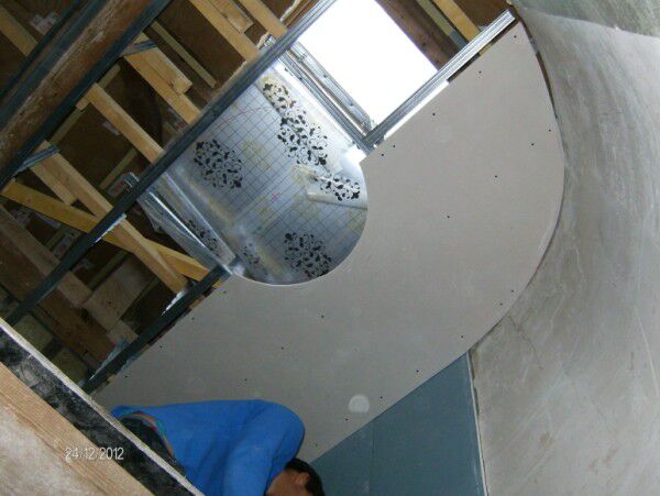 Het plafond van de trappenhal is juist geplaatst. Oef want dit was echt wel een moeilijk werk. Niet alleen stonden we op een stelling en was er onder ons een diepte van 10 meter, we moesten die gyprocplaaat er manueel tegenhouden (foto's 1 en 2). We zijn tevreden dat alles goed verlopen is en dat de plaat direct goed gesneden was. Voor de afmetingen hebben we ook wel wat afgezien. We konden immers niet overal even goed aan want de stelling kwam maar tot de helft van de trappenhal. Op foto 3 zien jullie de afmetingen, om maar een idee te geven .