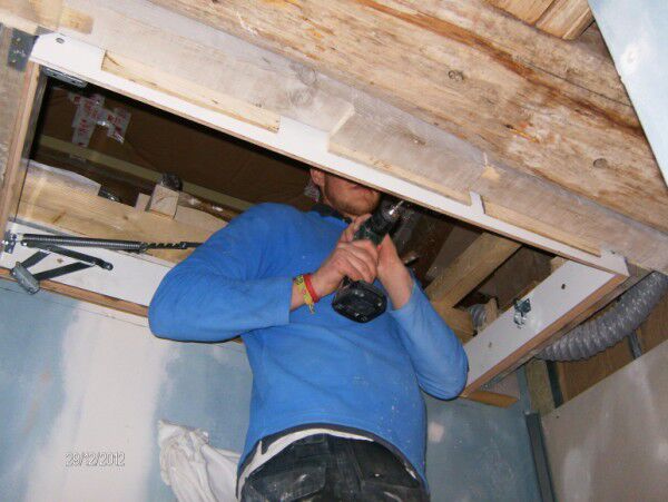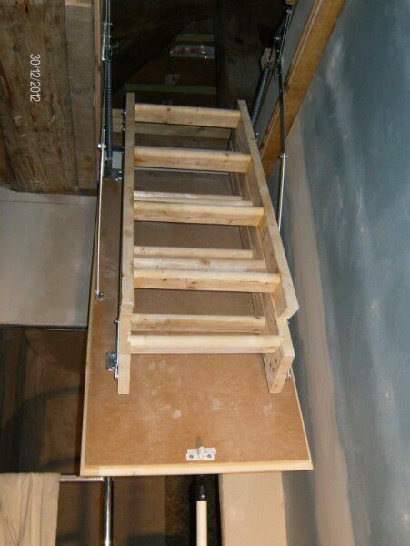 Nous avons acheté il y a quelques jours un escalier escamotable pour aller au grenier. Nous avions pensé avoir fait un bon achat qualité/prix, mais avions oublié que chaque chose a sa raison. Ce que nous n’avions pas vu c’est qu’il fallait encore tout assembler, un peu comme les meubles Ikea. Le plan n’était pas très explicite, dans la langue Allemande et il y avait plus de vis que nécessaire, mais nous y sommes parvenus ! Par après il fallait encore monter le cadre pour y attacher l’escalier. Comme toujours il y avait une poutre avec les cotés arrondis tout près du bon endroit et le cadre doit être à niveau, donc il fallait beaucoup de patience.