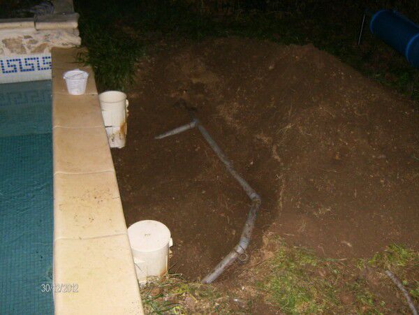 La fuite se trouve derrière les skimmers. Nous avons laissé descendre l’eau en-dessous des skimmers pour ne pas perdre plus d’eau. D’ailleurs en hiver c'est recommandé. Aujourd’hui nous avons enlevé la terre autour des buses et demain nous allons tester par où l’eau s’échappe. Espérons que nous trouverons vite l’endroit car l’eau n’est pas gratuite !
