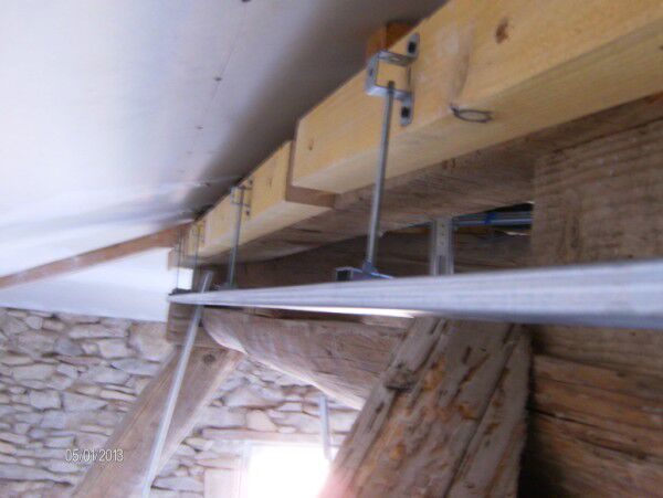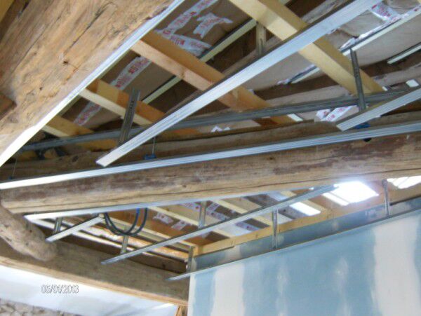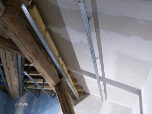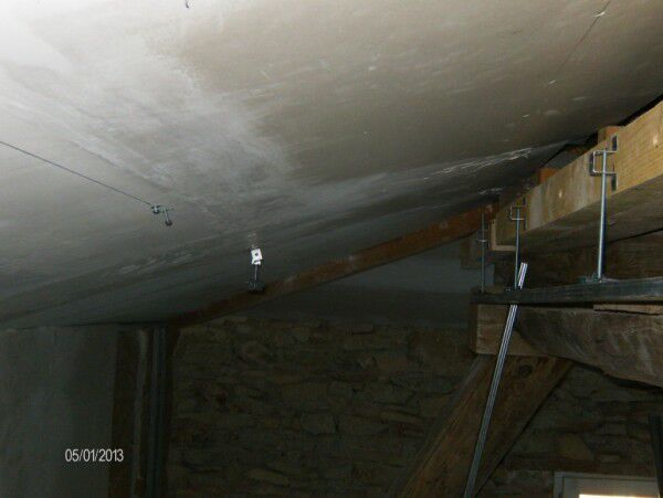 Depuis quelques jours nous avons commencé à placer les profiles en métal pour y attacher les plaques de plâtre des plafonds horizontaux. Nous avons déjà réfléchi beaucoup comment nous pouvions le faire car nous voulons à tout prix que les poutres restent visibles. Ceci n’était pas évident car avec les années le bois a travaillé et les poutres ne sont pas partout à la même hauteur. Quand nous avions défini la hauteur au-dessus de la poutre d’un coté, de l’autre coté nous arrivions à la moitié ou entièrement en-dessous. Cela autour de 3 poutres, car il y en a 3 par chambre. Photo 1.