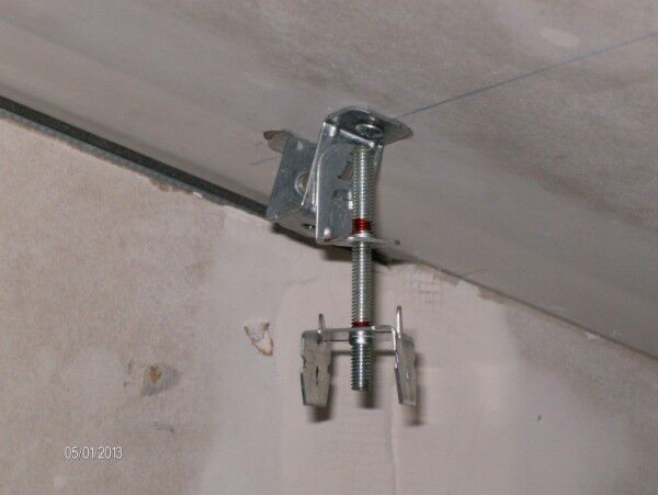 We hadden op het internet al gezocht naar materiaal om dit mogelijk te maken. Gelukkig bestaat er voor alles een oplossing maar dan moet het hier nog wel te verkrijgen zijn... Onze grootste zorg was iets te vinden om aan een schuine vlakte te bevestigen maar dat wel loodrecht naar beneden valt... Op foto 2 en 3 zien jullie het probleem. Er is dus een schuine zijde van het reeds gelegde plafond waar het nieuwe platte plafond moet aansluiten. We moesten dus een systeem vinden dat we in de schuine zijde konden bevestigen maar dat roteert en zo loodrecht naar beneden valt. FOTO 4. Je kan goed zien dat het ijzeren staafje aan een 2de element vasthangt en dat element kan draaien. Hiermee waren alle problemen dus snel van de baan ;-). Op foto 5 zien jullie dan het uiteindelijke resultaat. Omdat de foto van beneden is genomen is het misschien niet heel goed zichtbaar maar de 2 baren zijn wel degelijk waterpas. De eerste is bevestigd aan een extra houten balk, de andere aan het schuine plafond.