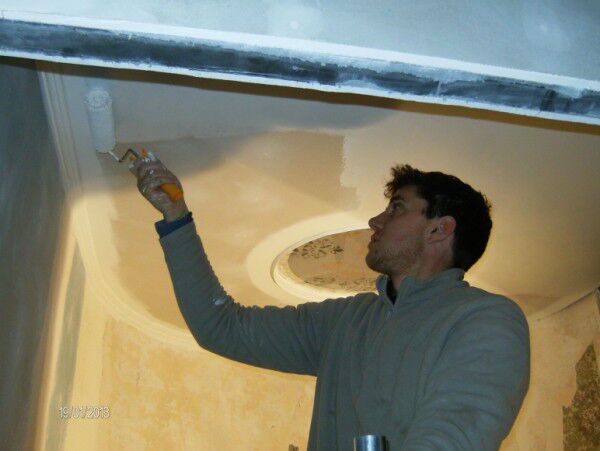 Het plaatsen van de metalen kaders voor het plafond hebben we al een tijdje afgewerkt. Dit ging ook veel moeilijker dan gedacht... Uiteindelijk is dit overal gedaan (2 slaapkamers en dressing). Ondertussen zijn we begonnen met al enkele afwerkingswerken. Het plafond van de trappenhal wordt nu geverfd en voorzien van omlijstingen. We moeten dit nu al doen omdat de stelling er nog staat. Van zodra dit allemaal klaar is kan de stelling weg en kunnen we weer naar boven met gyprocplaten voor de platte plafonds.