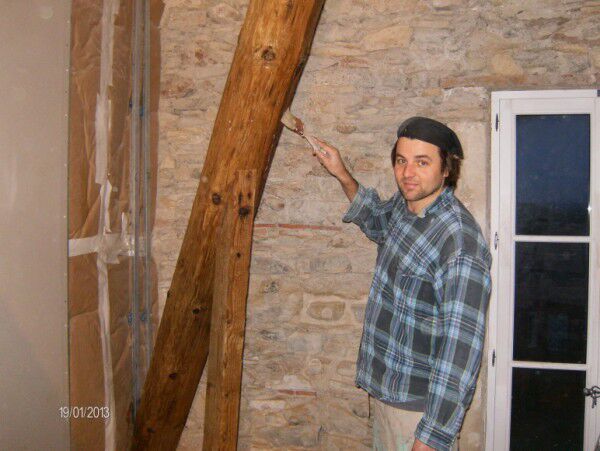 De balken in de gastenkamer zijn ook geverfd met een kleurloos vernis. We hebben gekozen om dit te doen voor het plafond bevestigd is zodoende we niets hoeven af te plakken. We zijn zeer tevreden over het resultaat. Eindelijk zien we hoe de balken er echt uitzien, zonder stof en vuil... .