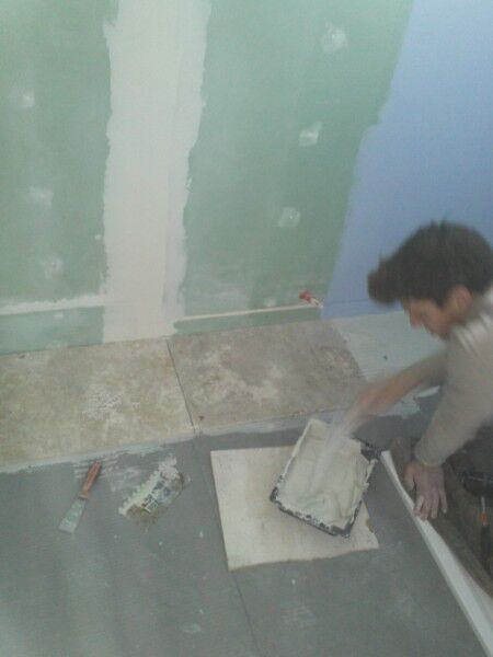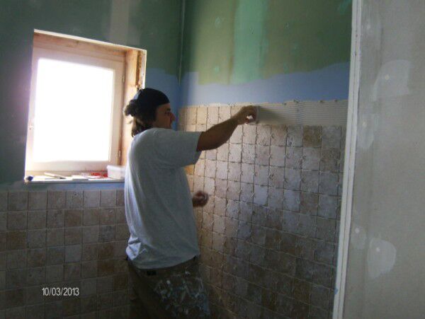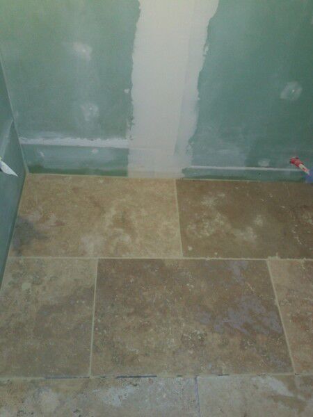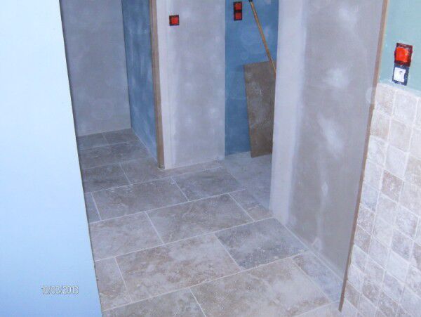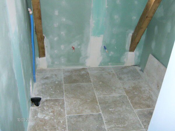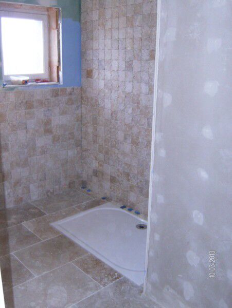 Na het schilderen van de plafonds zijn we begonnen aan het tegelen. Eindelijk iets anders op de grond om naar te kijken dan die OSB platen ;-). Eerst zijn we begonnen met de vloer van onze badkamer (kwestie van te zien hoe moeilijk het is om het daarna goed te doen in de gastenbadkamer ;-). Verassend maar waar ging dit zeer makkelijk. De badkamer en de gang waren dan ook vrij snel gedaan. Op foto 1 kan je het begin zien van het tegelen, foto 2 toont het resultaat van de gastenbadkamer en foto 3 is de gang tussen de slaapkamer en badkamer van het appartement. Na het tegelen was het dan de beurt aan het voegen. Om natuursteen te voegen moet je snel zijn... en dat hebben we gemerkt ;-). In het begin hebben we een beetje moeten aftasten hoeveel we konden doen zonder dat het voegsel te snel opdroogt maar nadien, net zoals het tegelen, ging alles zeer makkelijk. Op foto 4 zie je de eerste tegels die gevoegd zijn. Dan ben ik begonnen aan het tegelen van de muren. Met stenen die 10 x 10 meten kan je je al inbeelden dat dit een beetje een puzzelwerk was... Ondertussen is onze badkamer zo goed als helemaal getegeld en kan ik vrij snel aan de gastenbadkamer beginnen. Op foto 5 en 6 zien jullie het resultaat van onze badkamer. Het begint echt al meer en meer vorm te krijgen je zou al zin krijgen om een douchke te gaan nemen :).