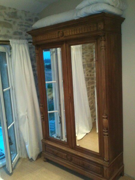 Onze eerste gastenkamer is intussen praktisch helemaal afgewerkt, wat echter nog ontbrak, was een kleerkast met grote spiegels (dit blijkt nogal een veelgemaakte opmerking te zijn van de gasten volgens het tv programma met 4 in bed , en hier hebben we dan ook rekening mee gehouden). Na enkele aanpassingen en renovatiewerken van deze antieke, authentieke Henri II-stijl kast, mag het resultaat zeker gezien zijn, ze staat er beeldig !!!
