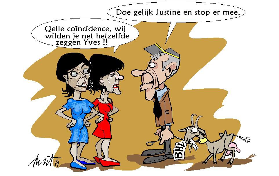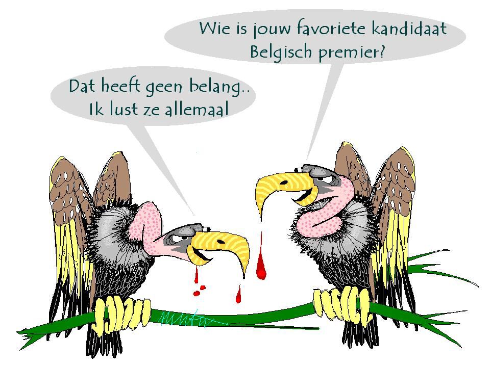 Beste allemaal, het kan gebeuren dat uw dienaar er even tussen uit knijpt. Kan verschillende oorzaken hebben. Enkele voorbeelden: hospitalizering; verlof; computercrash; internering...en het allerlaatste: het overlijden kan ook te vernoemd worden. Dit is dan niet "even er tussenuit", dus daar wachten we nog wat mee. Ondertussen is er op politiek vlak heel wat gebeurd. Daarom geef ik nu boven dit schrijven enkele tekeningen in chronologische volgorde, zonder verder commentaar. Mijn onvoorwaardelijke dank voor je begrip.