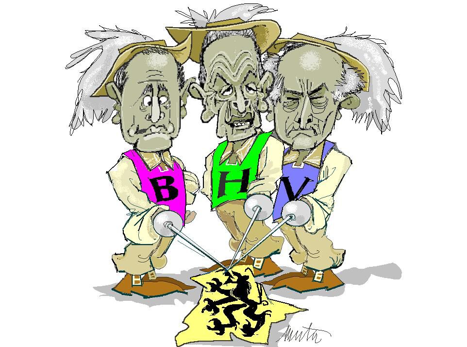 BARSTEND BELGIË DE KRANT ('T PALLIETERKE BVB) KAMPT ZEER DIKWIJLS MET PLAATSGEBREK ZODAT EEN POLITIEKE CARTOON ROEMLOOS IN EEN MAP VERDWIJNT; DE POLITIELE SCENE VERANDERT OOK VOORTDUREND EN NA VERLOOP VAN TIJD VERLIEST EEN TEKENING ZIJN "POINTE".IK HEB DEZE BLOG GESTART OM DE CARTOONS EEN KANS TE GEVEN ZICHZELF TE MANIFESTEREN VOOR WAT ZE WAARD ZIJN MAG IK HOPEN DE BEZOEKER EEN GRIJNS TE ONTLOKKEN BIJ HET GRASDUINEN TUSSEN DEZE SPOTPRENTEN,OF WAT GEFRONSTE WENKBROUWEN BIJ DE KLEINZERIGEN? POLITICI ZIJN HOGE BOMEN (DENKEN ZE MEESTAL VAN ZICHZELF) DIE IPSO FACTO VEEL WIND VANGEN. ALS ER ERGENS EEN TUSSEN ZIT DIE ZICH AAN EEN KARIKATUUR ERGERT, IS HIJ NIET UIT HET GOEDE HOUT GESNEDEN. UITSTAPPEN UIT DE POLITIEK WORDT ZELFS NIET OVERWOGEN! LAAT ONS EERLIJK ZIJN: HET ZOOTJE ONGEREGELD DAT ZICH OP DIT OGENBLIK (2007-2008) MET DE FORMATIEGESPREKKEN ONLEDIG HOUDT KOMT MET LEGE ZAKKEN TERUG NAAR DE KIEZERS. HUN "AANKLUNGELEN" HEEFT MAAR EEN DOEL: ZOLANG MOGELIJK BEZOLDIGD BLIJVEN EN INTUSSENTIJD DE EIGEN ACHTERBAN KILO'S STROOP OM DE BEK SMEREN.