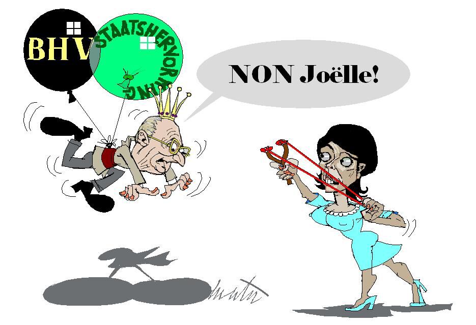 Er zit weer een nieuwe oktopus aan te komen. Die beesten zijn enorm soepel en kunnen bliksemsnel van vorm en kleur veranderen. Het eigenaardige van onze Belgische oktopus is dat hij er geen behoefte aan lijkt te hebben om van vorm of kleur te veranderen. Integendeel. Een en ander brengt met zich mee dat wat niet plooit, uiteindelijk moet breken. En in die breuk zal ons koningshuis aan het kortste eindje trekken. Wallonië lijkt blind te zijn voor dit gevaar en stuurt zijn meest starre zonen (en dochters) uit. Ons Joëlle mag dan wel een, wat men noemt, "schoon wijveke" zijn maar zij is te lomp om te begrijpen dat haar aanvallende instelling enkel de Vlamingen (eindelijk) wakker houdt. De ballonnetjes waar ons vorstenhuis aan vasthangt zijn gevuld met zéééér lichte, niet in te ademen gassoorten. En als den 'Albert' niet te vlug aftreedt bespaart hij onze 'Fluppe' een crash.