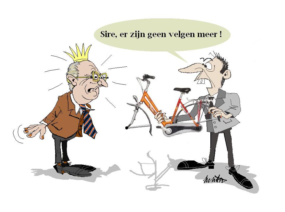 De kranten ; en ik spreek hier niet over de serieuze kranten lijk 't Pallieterke, neen, ik heb het over de huis-tuin-en keukenpers van alledag, wel, die kranten zingen over het algemeen unitaire lofhymnes. Waarbij de kool (geld van?) en de geit (de Coburgs) gespaard wordt. Tot het te gortig wordt en een hoofdredacteur het mogelijk acht de lekken te inspecteren. Dan blijkt plots dat rioolgeur,die verondersteld wordt uit rioolkrantredacties te komen, ook uit de paleiselijke vertrekken walmt met ongekende hevigheid.Tot groot ongenoegen van het Weverke, dat de dreiging van een nakend politiek "pootje zetten" voelt naderen. Een pluim dus voor de hoofdredacteur van DE STANDAARD: Peter Vander Meersch die het tijd vond de kroon te ontbloten...Wat prompt een aangepaste tekening van mij uitlokte. Ik wil U deze cartoon niet onthouden.