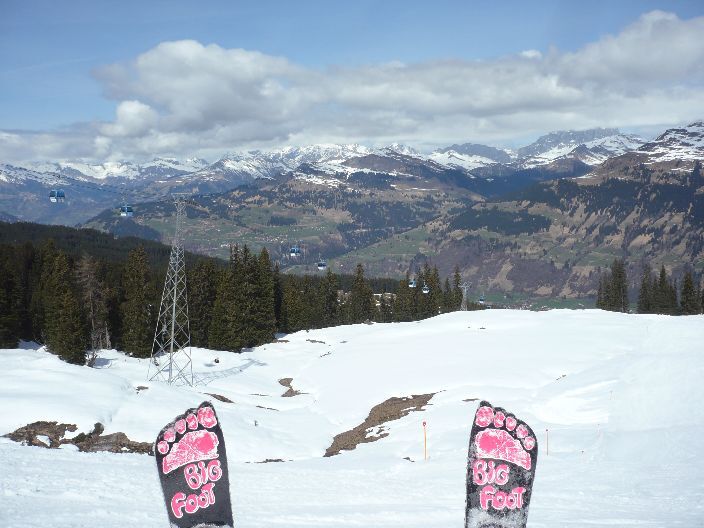 Vrijdag heb ik overigens het grootste gedeelte van de dag off-piste doorgebracht. De gevaarlijkheid hiervan vond ik wel meevallen, gezien het feit dat ik een iets andere vorm van off-piste vertoeven geprobeerd heb, hetzij ietwat minder sportief en ietwat decadenter dan de "officiele" off-piste verklaring. Op een anderhalf persoons ligbed/matras/stoel van nivea heerlijk liggen bakken in de zon genietend van de ploeterende mensen die zich door de "schneemangel" worstelden, een ijskoud glas cola en een koel briesje is voor mij een perfecte off-piste ervaring. Op datzelfde terras heb ik ook nog even weer gepraat met mijn grote vriend "Cho", de eigenaar van de tent. We hebben samen nog wat haus-gebrauen Röteli gedronken op aandringen van hem, voordat het 5 voor 4 was en dus tijd voor de laatste lift. Gezellig.