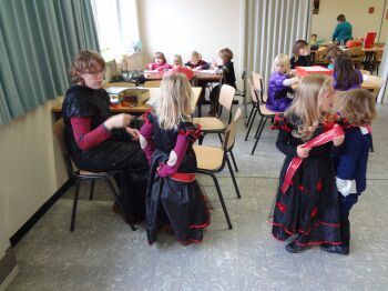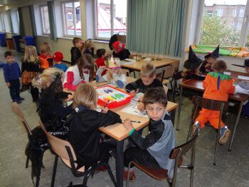 Het halloweenfeest was super leuk! We maakten pompoensoep, de kleuters mochten zich laten sminken, we maakten griezelige tekeningen en er was een griezelparcours. De kleuters mochten hun kostuum ook eens showen op tovermuziek.