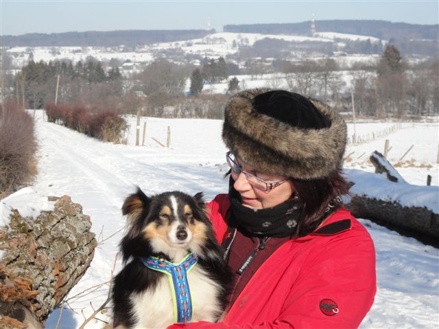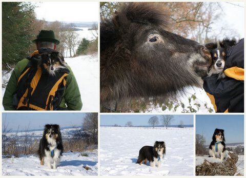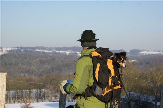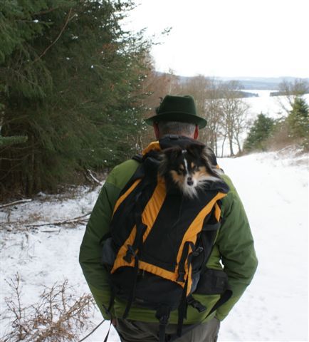een sheltie zit in de rugzak , Cedi stond op een moment echt te bibberen van de kou ,