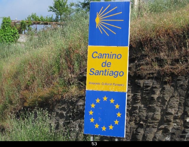 46. Alpenflora bij de Cruz de Ferro op 1 500 m hoogte 47. Pelgrims komen aan in de abdij van Ponferrada waar 144 bedden staan 48. Bij het pelgrimsbeeld in Pedrafito do Cebreiro op 1 099 m hoogte 49. Boven op de 'Col do Cebreiro' op 1 300 m 50. In de preromaanse kerk van Cebreiro 51. De tiende-eeuwse kerk van Cebreiro 52. In de slaapzaal van de pelgrims in de abdij van Samos 53. Dit bord kom je wel duizend keer tegen op de camino 54. Sint-Jacobsbeeld in de kerk van Boente