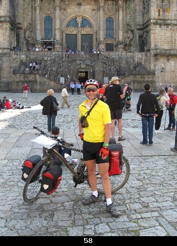 55. Eucalyptusbomen is Galicië 56. Nog 10 kilometer en ik ben in Santiago 57. Al fietsend gefotografeerd, zo roekeloos ben ik van blijdschap 58. Aankomst op het grote plein voor de kathedraal van Santiago 59. Een Russische collega fotografeert mij voor de kathedraal 60. Een pelgrim tekent de kathedraal: iedereen verwerkt z'n vreugde op zijn manier 61. In het bureau waar we ons 'diploma' mogen afhalen 62. Het reuzenwierookvat of 'botafumeiro' onder de koepel van de kathedraal 63. Nog een foto van de kathedraal