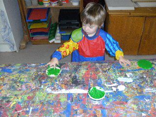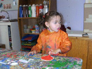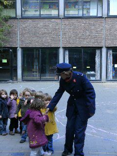 Farah had vandaag een verkeerslicht mee naar de klas. We besloten om er ook een te maken. Met onze vingers schilderden we rood en groen op een rond karton. (morgen is oranje dan aan de beurt) Maandag is Victor jarig. Samen met Virginie knutselde hij zijn spokenkroon. 's Middags was er poppenkast: Martine verkleedde zich als politie-agent (met de kleren die Billie meegebracht had). We zagen verschillende voertuigen in de poppenkast die moesten stoppen als het rood was en door mochten rijden als het groen was. We speelden ook nog buiten met die kleuren: als het groen was mochten de kindjes iets doen, was het rood dan moesten ze stoppen..