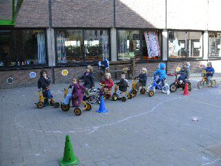 We werkten verder aan de verkeerslichten. Vandaag was de kleur oranje aan de beurt. Met een sponsje schilderden we oranje op een rond karton. Hilde (directie) speelde ook even politie-agent. 's Middags was er ons fietsparcours op de speelplaats.