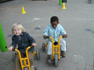De mama van Farah had prachtige dievenmaskers gemaakt voor ons! We speelden diefje en politie.. We maakten ook nog auto's door te schilderen met een tandenborstel. Enkele kindjes speelden bij Mimi het spel: "bambino loco". 's Middags gingen we turnen met Saskia: de kleuren rood en groen werden aangebracht. Rood= stoppen; groen= doorrijden. We deden ook verschillende voertuigen na.