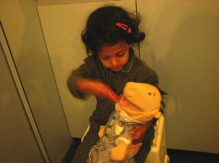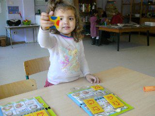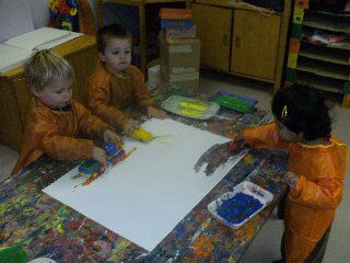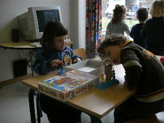 Vanmorgen kregen we 2 (valse) politie-agenten op bezoek in de klas. We schilderden met auto's. Mimi kwam ook even in de klas en speelde met enkele kinderen 'bambino loco' Juna had een kleurenspel meegebracht van thuis waar ook mee gespeeld werd. 's Middags gingen we turnen met Saskia: de kinderen speelden met de grote dikke mat..
