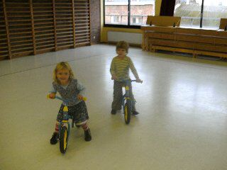 We speelden maar heel kort in de hoekjes: puzzelen, gezelschapsspel, fietsen, torens maken,... Saskia kwam ons halen om te turnen: we reden met heel speciale fietsen rond. Nog yoghurt eten, een verhaaltje en de dag zat erop!