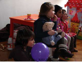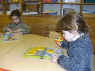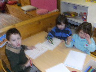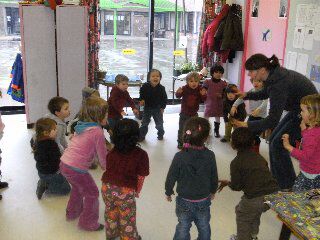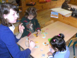 Vandaag maakten we afdrukken uit gips. Virginie speelde een memory van dino's met ons. We speelden ook nog een muzikaal pak. Elke keer de muziek stopte mochten we een stuk krantenpapier van een cadeautje scheuren. We moesten dan allemaal opdrachten doen: bewegen op muziek, een dino nadoen, luisteren waar een muziekinstrument verstopt zat... 's Middags was er poppenkast: een verdwaald meisje moest opdrachten doen om haar mama terug te vinden..