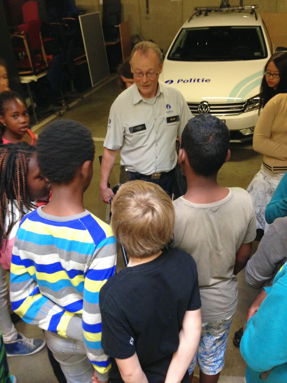 Vandaag brachten we een bezoek aan de politie in Leuven. Dat was bijzonder interessant. Tijdens de rondleiding mochten we een kijkje nemen in de cellen, bij de dispatching, leerden we hoe een ondervraging gebeurt, hoe men vingerafdrukken neemt, mochten we in de voertuigen zitten, het materiaal bekijken... om een lang verhaal kort te maken... We kregen een blik op het spannende politieleven. We waren zeer enthousiast. Kijk maar naar de foto's!!