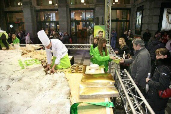 Radiozender JOEfm serveerde vandaag een reusachtige verjaardagstaart in het Antwerpse Centraal Station. De taart had een diameter van elf meter, een meter meer dan het vorige record. De zender hoopt met het enorme gebak het Guinness Recordboek te halen. In de taart ter ere van één jaar JOEfm zaten 23.000 eieren, 65 kilo boter, 250 kilo bloem en 1.200 kilo krieken.