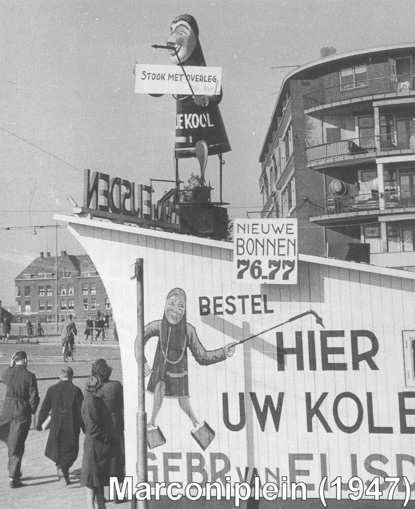 Deze foto uit 1947 laat het Marconiplein zien hoek Mathenesserweg toen het nog een vrij rustig plein was. Heden ten dagen is het Marconiplein een zeer belangrijk en druk plein geworden omdat het de doorgaande weg is van de wijk en het westelijk havengebied waaronder de Merwedehaven waar veel fruit wordt overgeslagen naar de snelweg A20. Tevens is het Marconiplein heden ten dagen een belangrijk knooppunt voor het Rotterdamse openbaar vervoer diverse trams komen hier en het is tevens een metro station. Op de plek waar op de foto het houten keetje staat is nu een enorm lelijk momument gekomen door een of andere kunstenaar ontworpen maar waarvan geen enkel buurtbewoner weet wat het precies inhoudt en wat de betekenis is van dit monument.