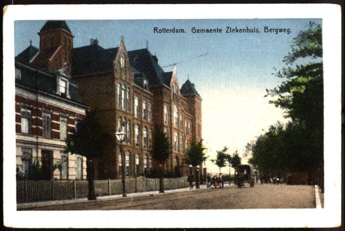 Deze ansichtkaart laat het Bergweg ziekenhuis zien vermoedelijk tijdens de 20er en 30er jaren. Het ziekenhuis was een gemeente ziekenhuis en ondanks dat het Bergweg ziekenhuis heet was naar mijn weten de ingang van dat ziekenhuis gelegen aan het Lisplein.