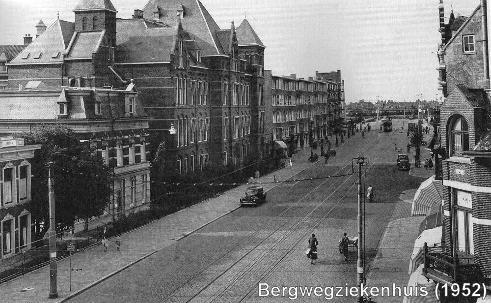 Deze foto uit 1952 laat het Bergweg ziekenhuis zien gelegen tussen de Bergweg en het Lisplein. Ondanks dat iedereen het Bergweg ziekenhuis noemde was de ingang van het ziekenhuis niet aan de Bergweg maar aan de achterkant gelegen aan het Lisplein. Eind 20e eeuw is dit ziekenhuis samen gegaan met het Eudokia ziekenhuis welke gelegen was aan de Bergsingel en Bergweg nabij het voormalige treinstation Bergweg en verhuist naar Capelle a/d IJssel en heet sinds dien IJsselland ziekenhuis.
