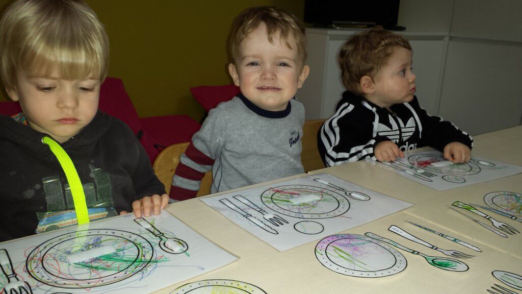 Vandaag waren we druk in de weer met onze kleurpotloodjes. We hebben eerst alles ingekleurd (bordje,mes,vork,lepel) en daarna hebben Griet en Tine alles uitgeknipt.