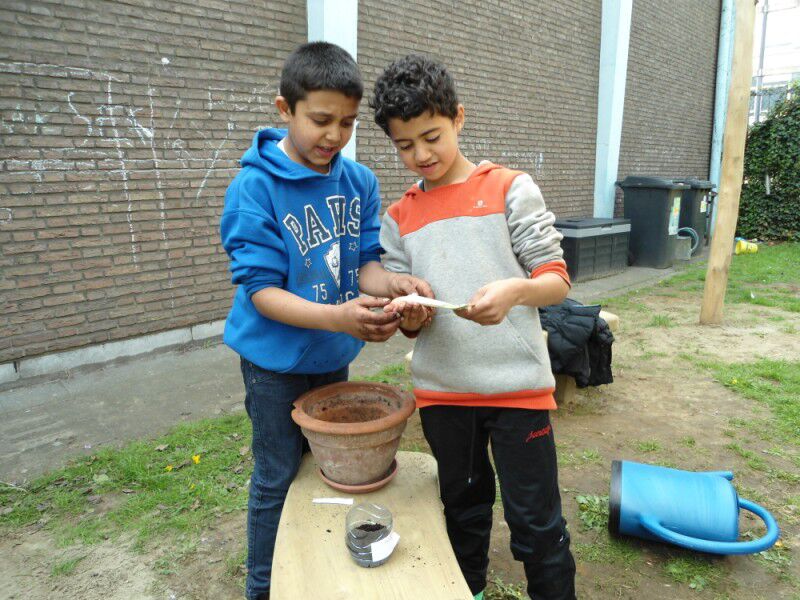 We pakten een pot en dan staken we de zaadjes in de potjes. We moesten de zakken zand in de bak leggen voor onze speelplaats. Het was veel werk voor ons. Peter en Mohammed