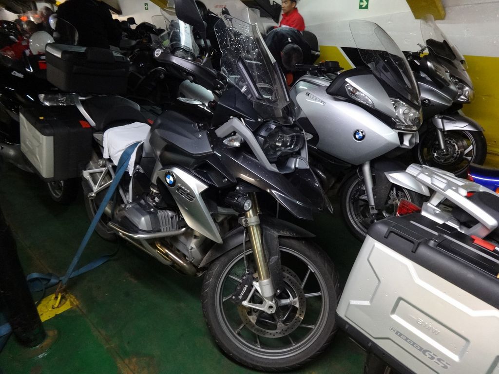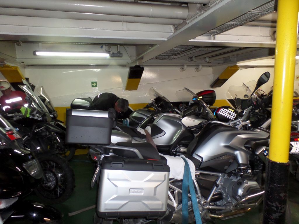 Harley jongens uit Bretagne stonden onze motoren op een tussendek. Mooie kajuit